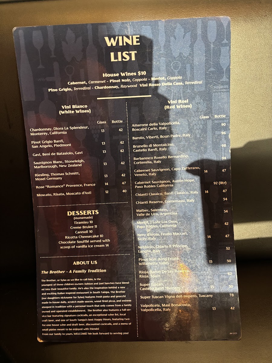 Welcome to The Brother Trattoria, a delightful Italian escape located at 2402 S MacDill Ave, Tampa, FL. This charming trattoria invites you with its warm ambiance, making every meal feel like a special occasion. The menu showcases a blend of classic and innovative dishes, with highlights like their wood-fired pizzas boasting a perfect crispy crust, and the tender chicken parmigiana, praised for its golden coating and rich sauce.